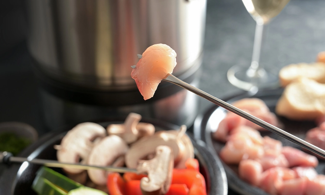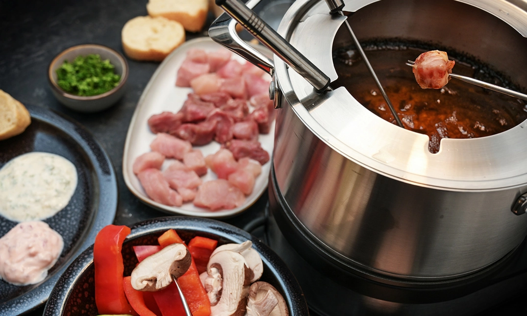 Geniet van een heerlijke fondue bij Bistro @ Sea: met kalkoen, kip, rundvlees, balletjes, spekrolletjes, friet, huisbereide sausjes, een fris slaatje en meer