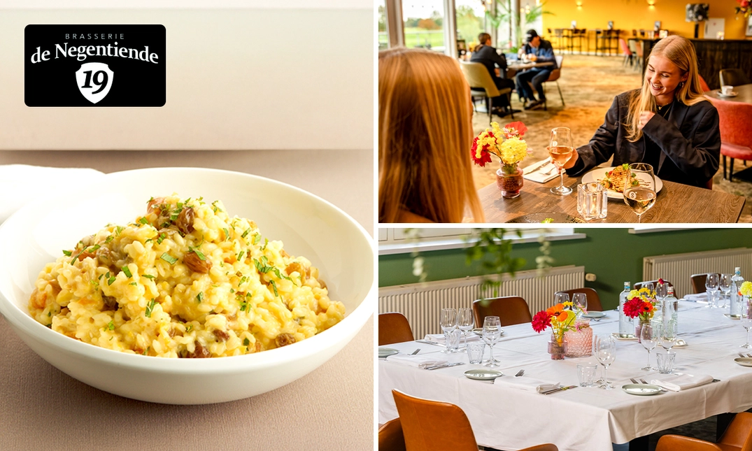 Kom even heerlijk samen voor een gezellige avond gevuld met lekker eten! Bij Brasserie de Negentiende ben jij van harte welkom om aan te schuiven voor een overheerlijk 3-gangendiner à la carte. In de gezellige, groene omgeving van de golfbaan geniet jij van lekker eten, warme sferen en ervaar je een ideale avond uit. Geniet ervan!