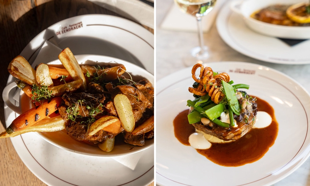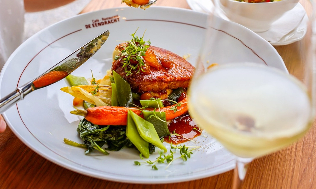 Proef de pure smaken van De Eendracht in ’t IJkgebouw met een 3-gangendiner à la carte: geniet van bijvoorbeeld terrine van gevogelte, cannelloni gevuld met pompoen of een tompouce met appel
