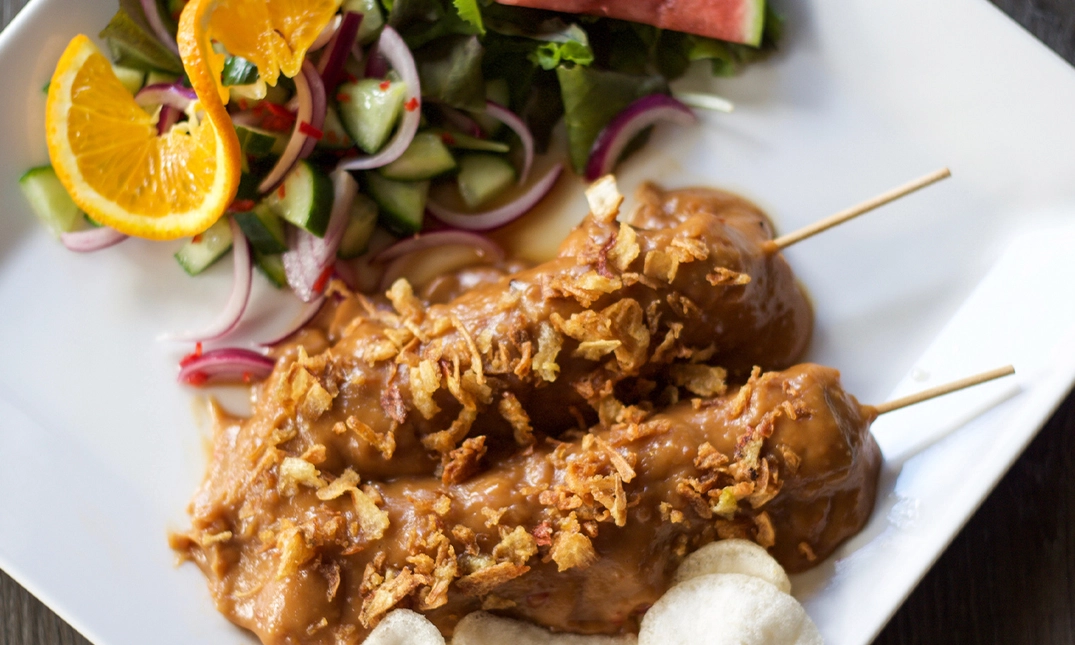 huisgemaakt, met satésaus, friet, kroepoek, gebakken uitjes en zoetzure groente-sla