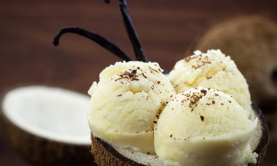 drie bolletjes kokos ijs met slagroom - IJsbollen