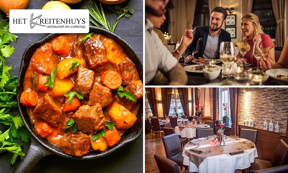 Kom een avond uitgebreid tafelen bij Restaurant Het Kreitenhuys! Dit sfeervolle en gezellige restaurant biedt de perfecte setting voor een fantastische avond uit met vrienden, familie of romantisch samen met je partner. De chef-kok laat jou drie gangen lang genieten van de meest tongstrelende gerechten, klaargemaakt met verse streekproducten. Wij wensen jou alvast een fijne avond!